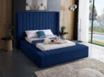 In this Velvet King Bed, ensconce yourself in royal modernism. This bed is difficult to ignore due to its extremely large headboard, making it the center of attention in your private haven. The plush and inviting cushioned headboard is perfect for leaning against when reading the morning paper or watching TV. The headboard has an opulent appearance that is enhanced by the use of gold trim and channel tufting. With every snooze, the luxurious and buttery-soft blue velvet upholstery will make you feel like a king or queen.
