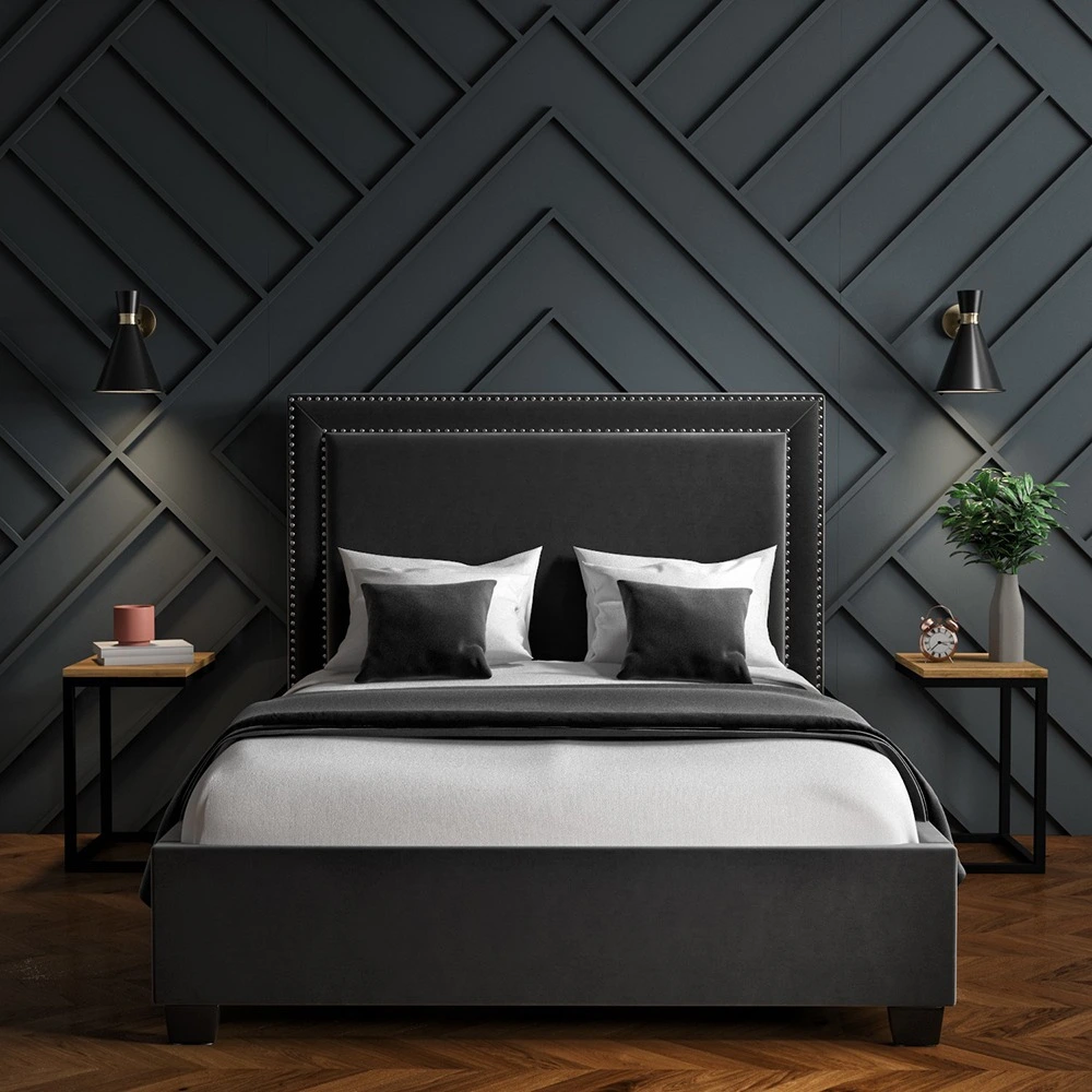 - A tall headboard with distinct stud accents. This is an excellent focal point for your bedroom.