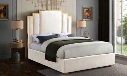 Gold trim high headboard velvet upholstery bed