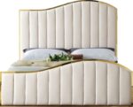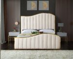 Make your bedroom a dream come true with this gorgeous cream velvet king size bed. This stylish bed commands your attention in addition to grabbing it. It features a stunning polished gold metal frame that holds cream velvet upholstery with channel tufting for texture on the headboard and footboard. The headboard and footboard’s waves conjure up a dramatic image of a boat rolling on the waves at sea, lulling you to sleep and ensuring a restful night’s sleep.